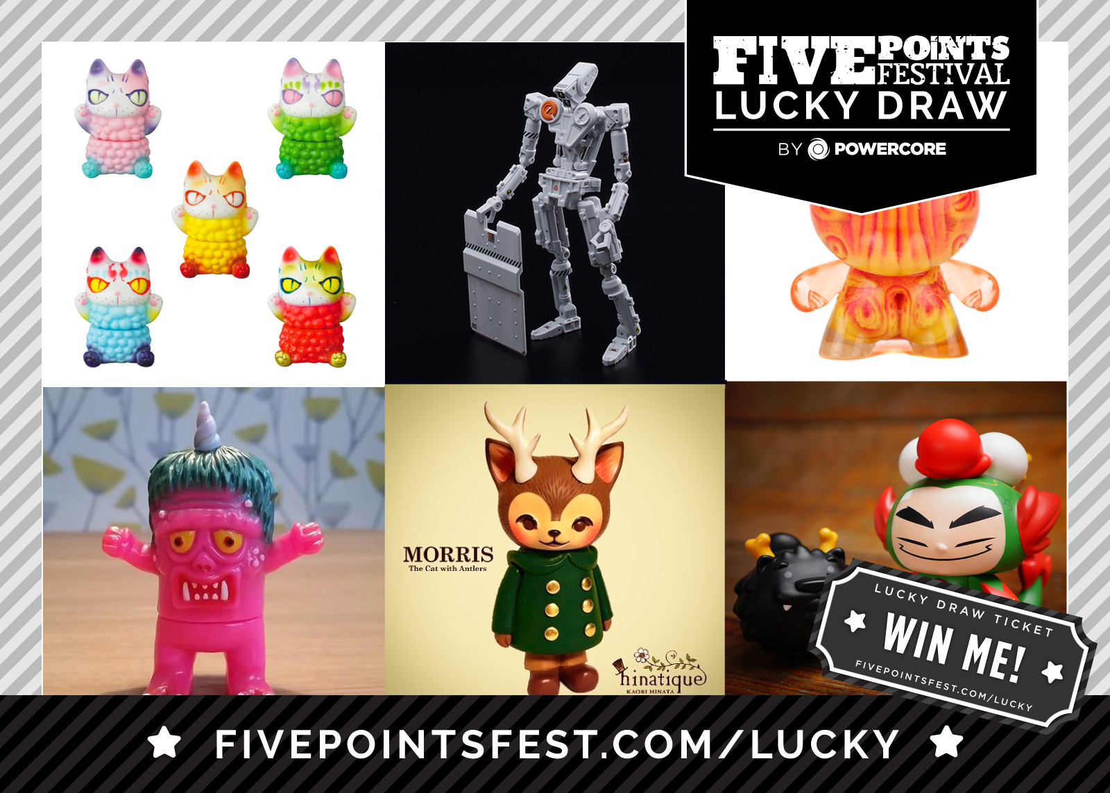 Would you like to WIN toys while you’re attending Five Points Festival? We’re excited to bring to you the Five Points Festival Lucky Draw Game in partnership with PowerCore where drawings for exclusive Designer Toys are announced LIVE on the shiny new Sweepstakes Page at https://fivepointsfest.com/lucky/ . Just open up your browser on your phone and play!