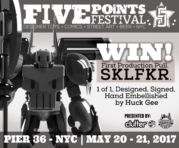 Meet the SKLFKR, a 20″ tall, mecha, skull-laden, resin robot by Huck Gee! Five Points is very excited to give you the opportunity to win a ONE of ONE, first pull of this beast of an art toy!